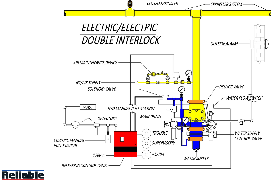 Veamos este escenario: la presión neumática en el sistema de enclavamiento doble Reliable Tipo D, es supervisada de forma continua por un interruptor de baja presión. En el caso de un rociador activado, y sin hay señal de detección coexistente, se informa al panel de liberación de una condición de baja presión. Sin embargo, cuando una condición de alarma está activa en el panel, la señal de baja presión se convierte (en esencia) en un segundo detector. Al recibir la segunda señal de detección, se cumple la programación del panel de liberación, se energiza la válvula solenoide eléctrica y se abre la válvula de diluvio. Los sistemas que utilizan la detección eléctrica y la "captura" eléctrica de la pérdida de presión neumática se denominan, lo adivinó, sistemas eléctricos / eléctricos. El mantenimiento adecuado de la presión neumática es fundamental dada la importancia del interruptor de presión para liberar el sistema. Por esta razón, los internos Tipo D, incluyen un dispositivo de mantenimiento de presión, modelo A-2, que proporciona una presión constante del sistema y restringe adecuadamente el aire o nitrógeno de reemplazo. Esto, a su vez, impulsa la necesidad de un suministro neumático almacenado, en otras palabras, un tanque.