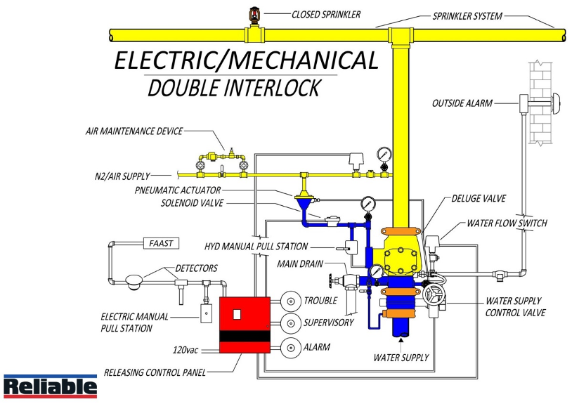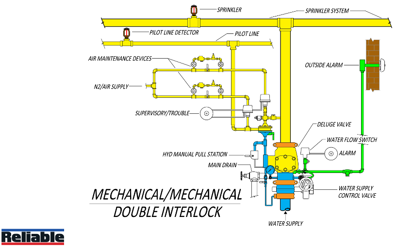 Los sistemas (o válvulas) que se disparan únicamente por pérdida de presión neumática se denominan sistemas de tubería seca. En ese sentido, los sistemas de acción previa de enclavamiento doble son un tipo especial de sistema de tubería seca que no se puede liberar hasta que se activa el sistema de detección y los rociadores "coexisten".